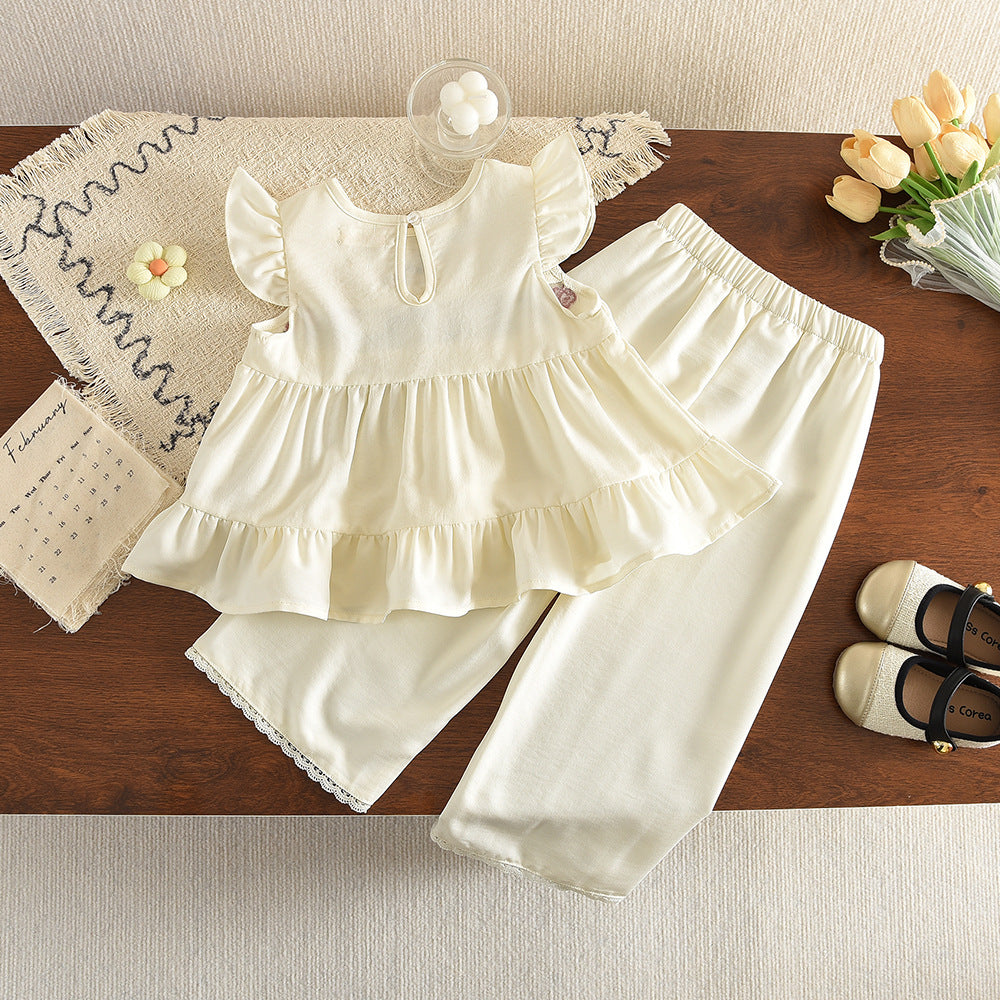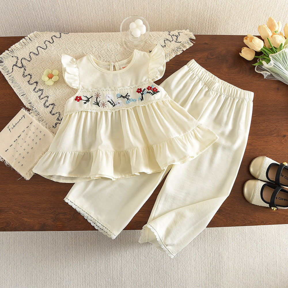 【100-140】フラワー刺繍ノースリトップス×ロングパンツセット