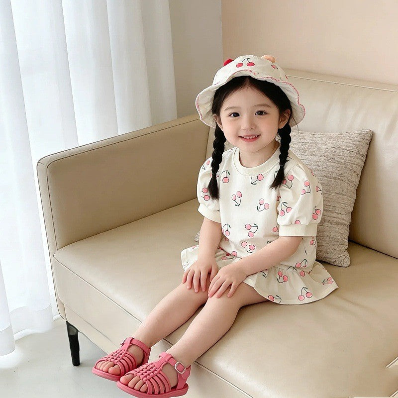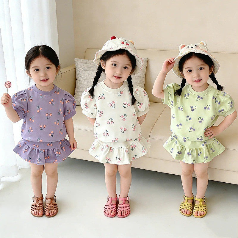 【90-130】チェリー柄パフスリーブトップス×ミニスカートセット