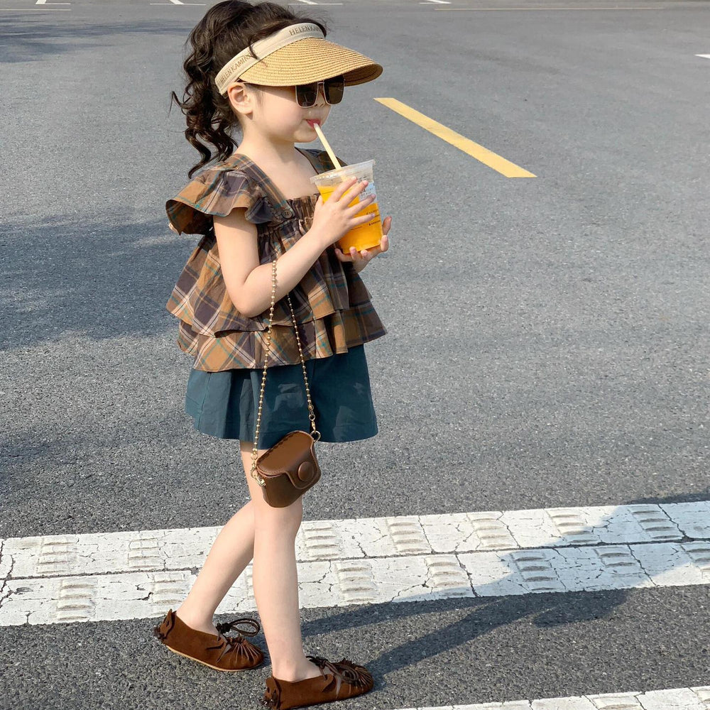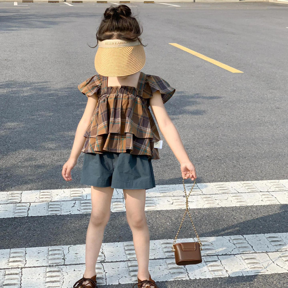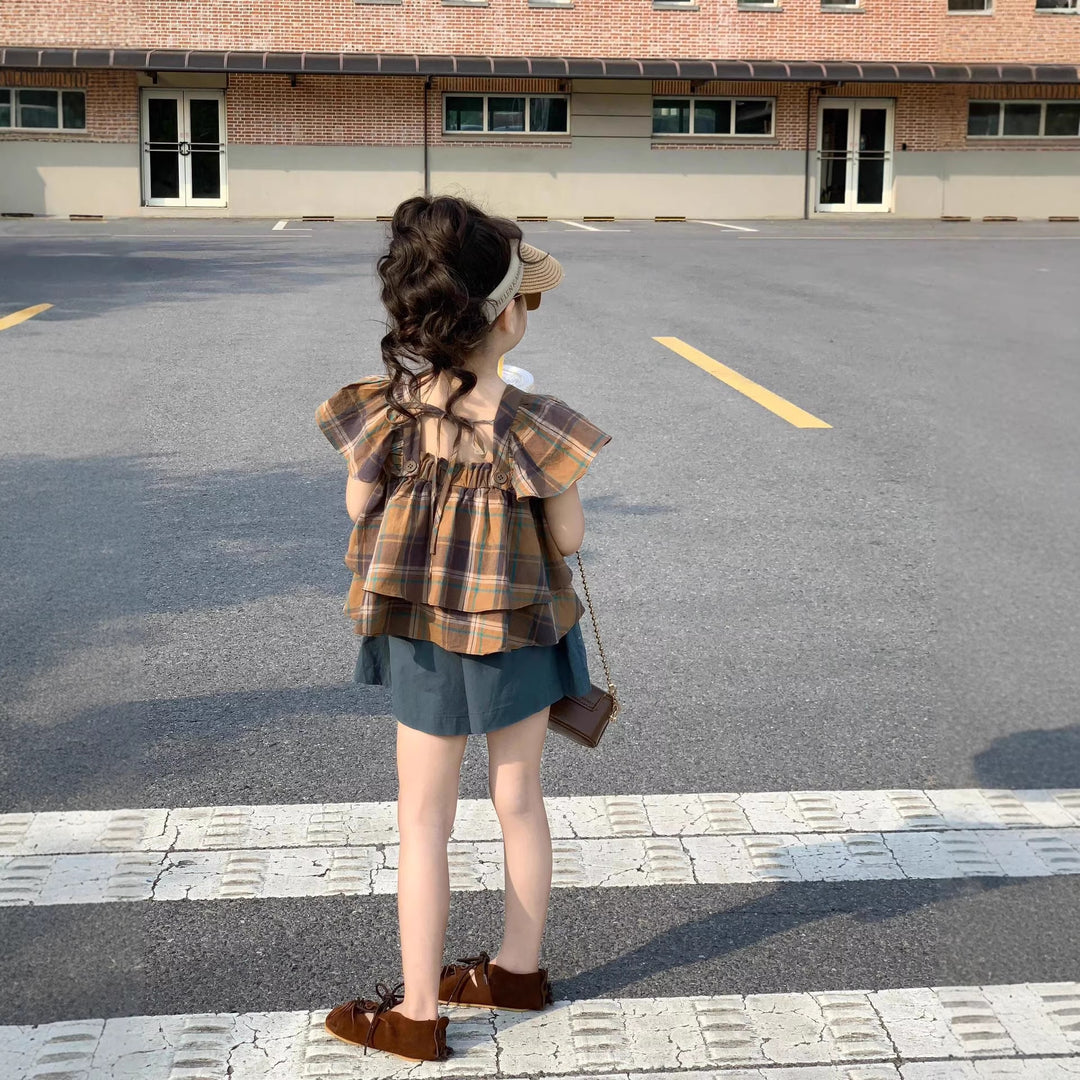 【90-140】フリルデザインチェック柄トップス