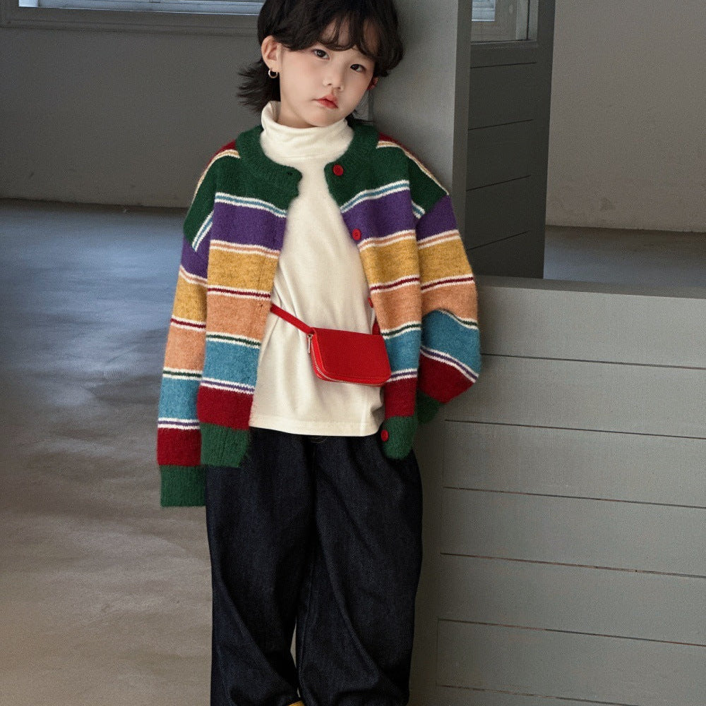 【90-150】カラフルボーダー柄カーディガン