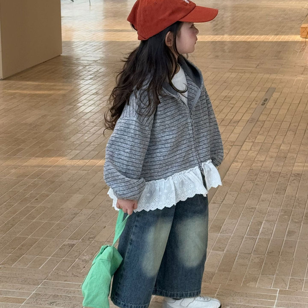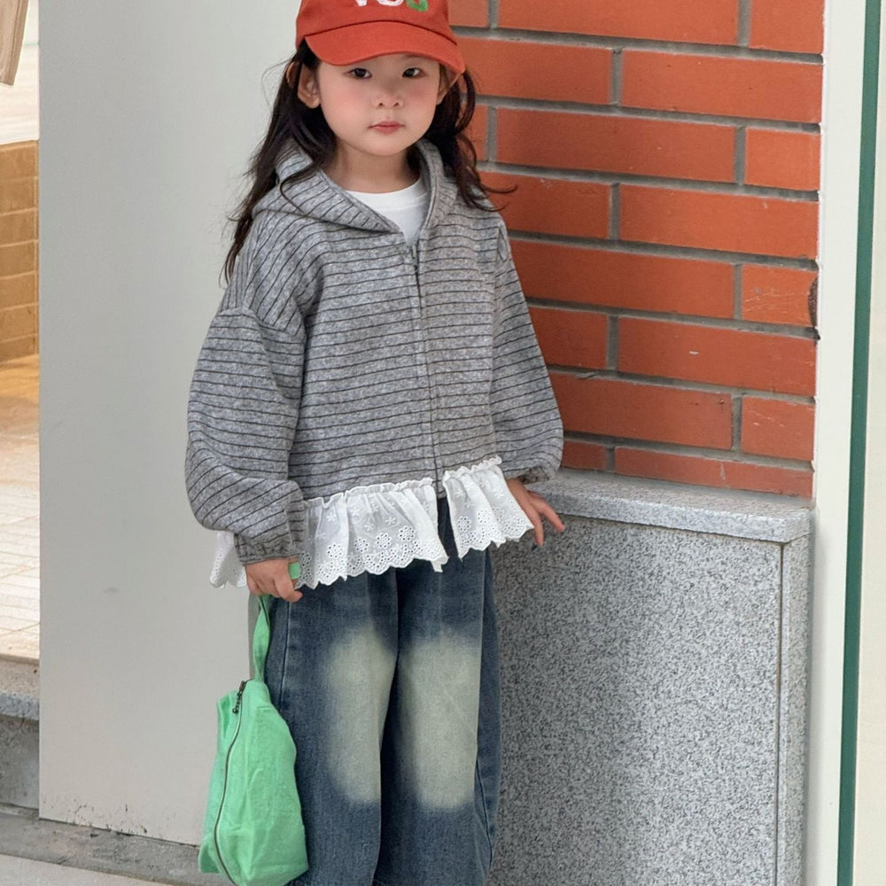 【90-140】レースヘムボーダー柄フルジップパーカー