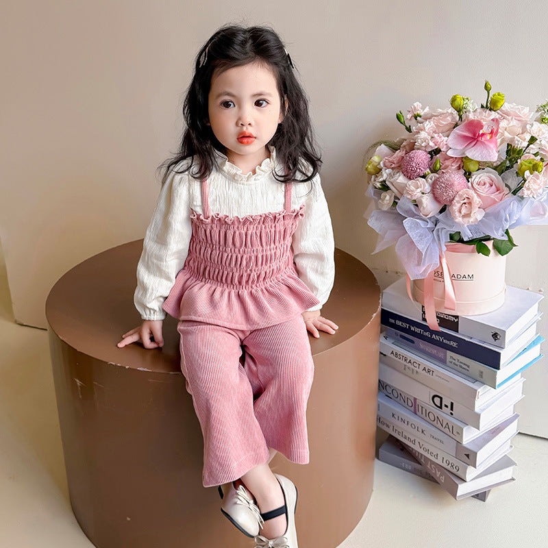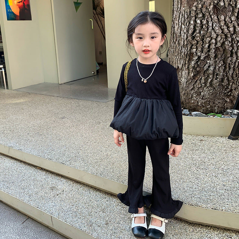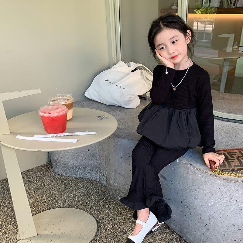 【90-140】レイヤード風トップス×フレアロングパンツセット