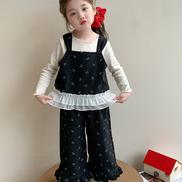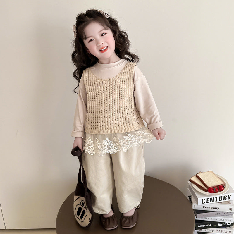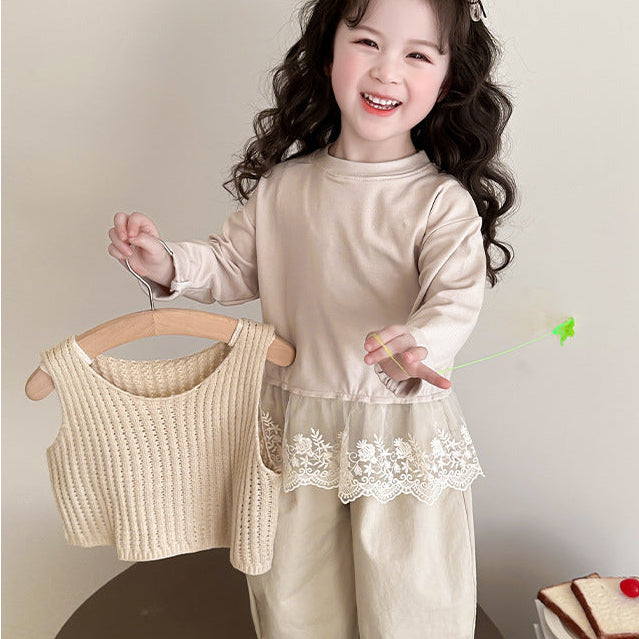 【90-140】レースヘムトップス×ベスト×ロングパンツセット