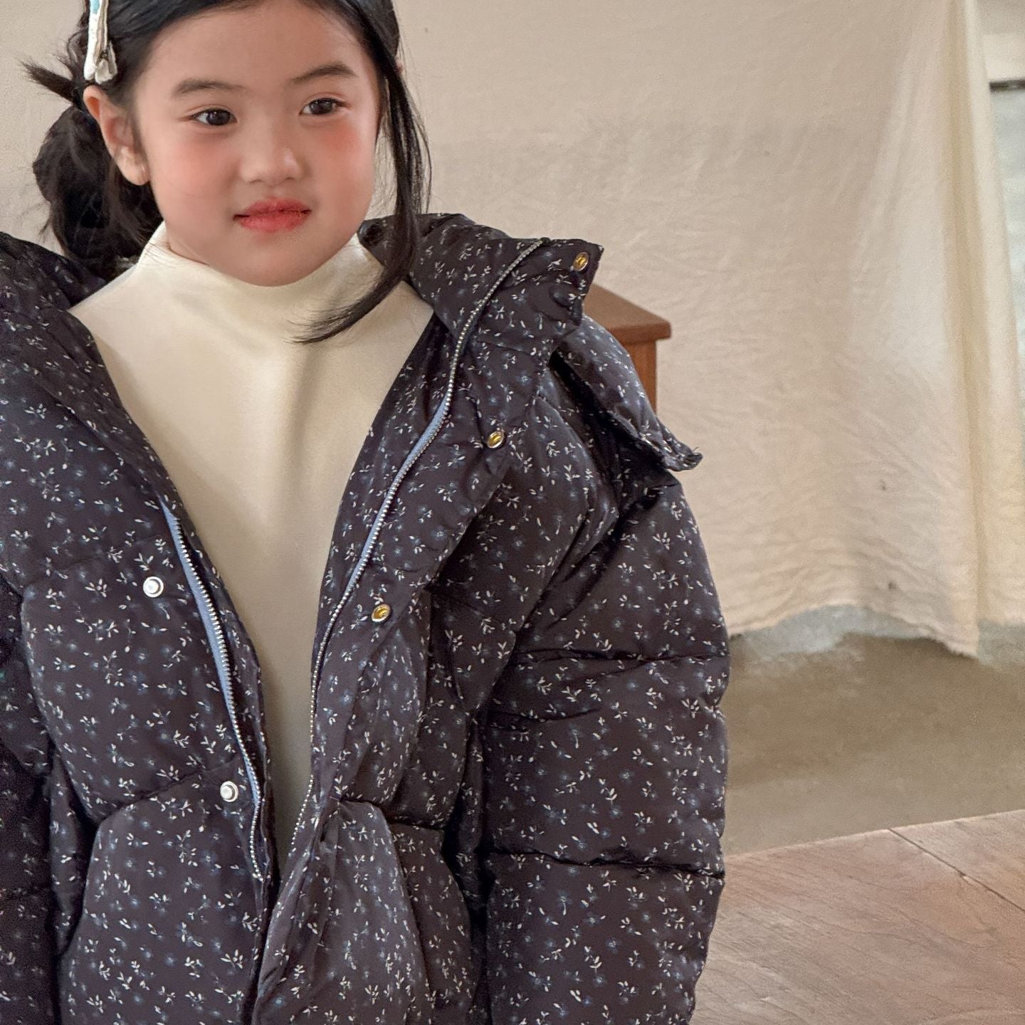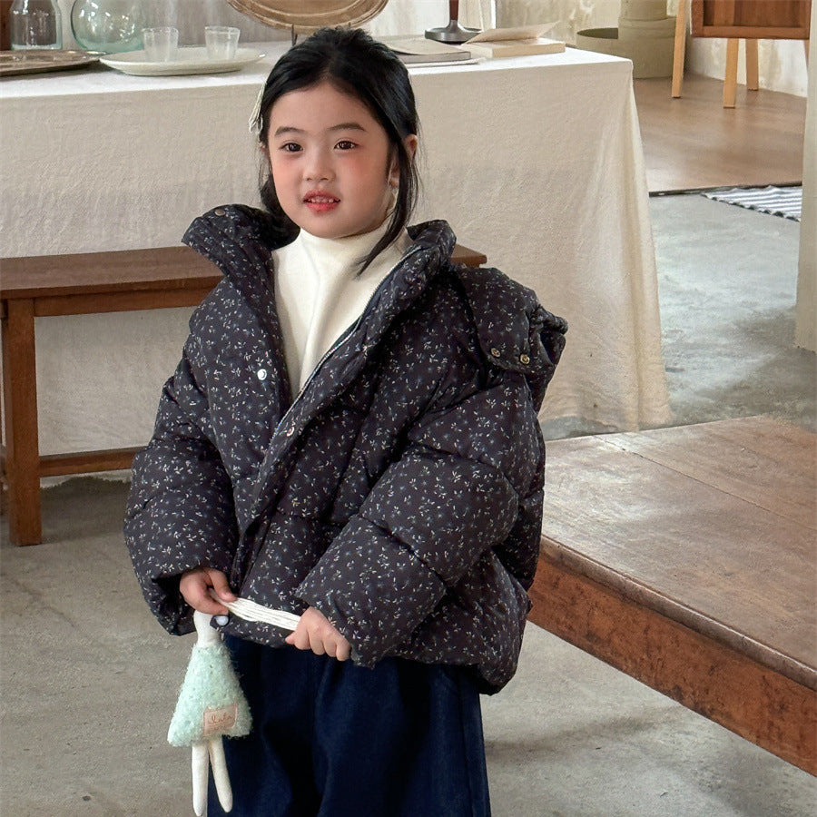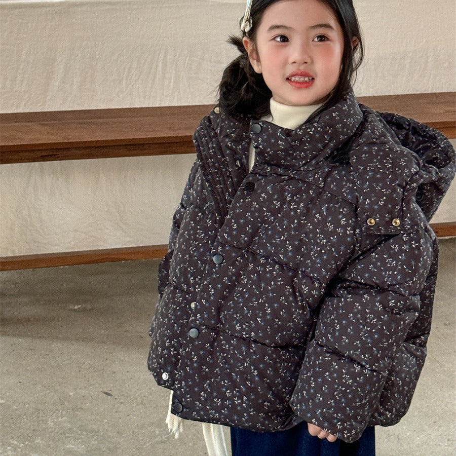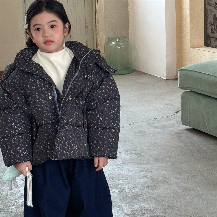 【90-140】フード付き小花柄中綿ジャケット