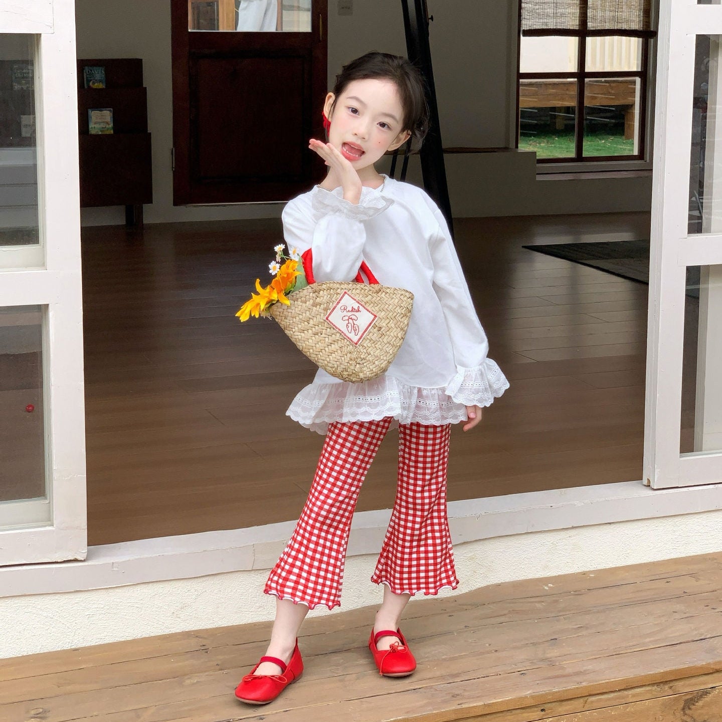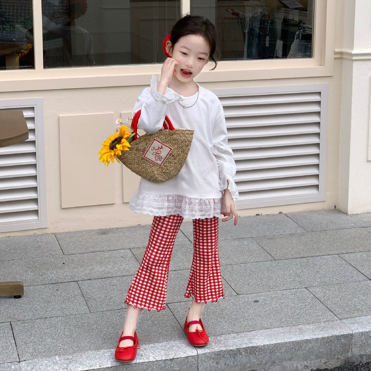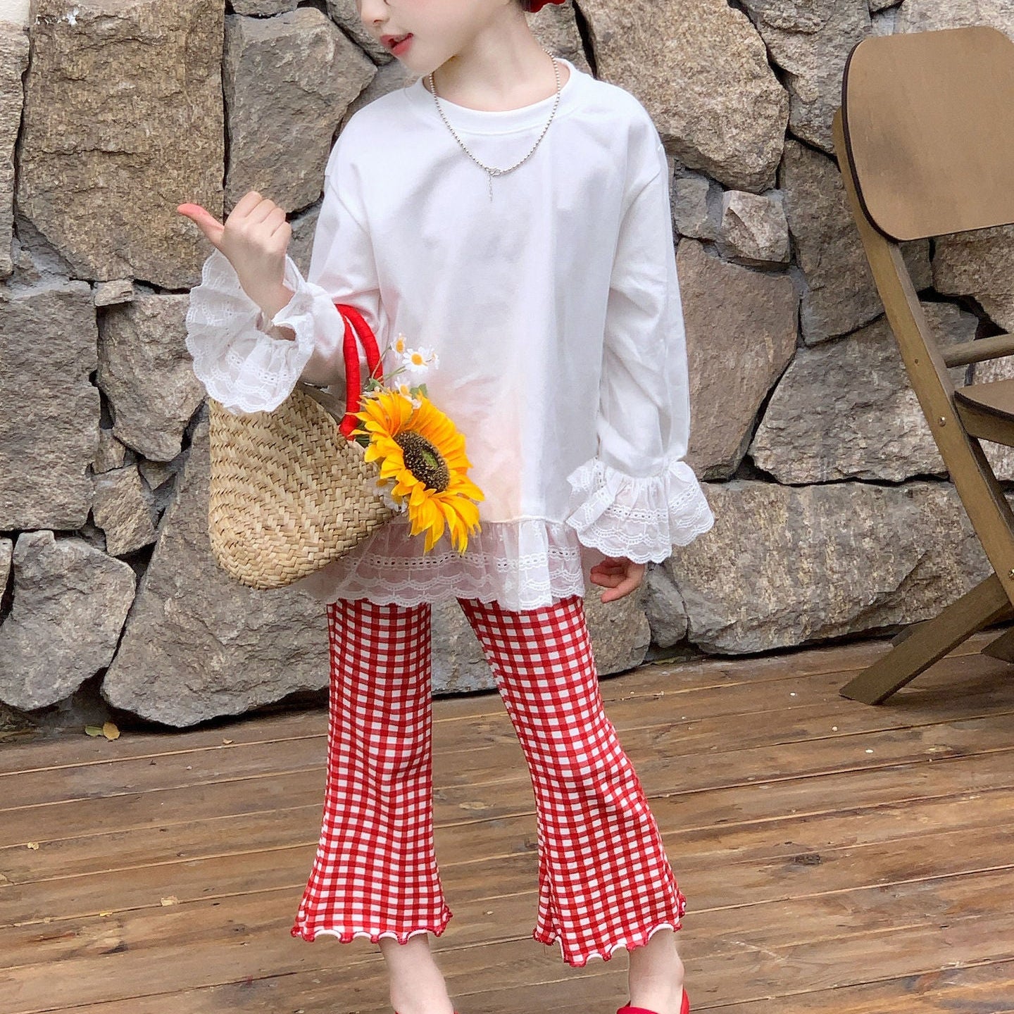 【90-140】チェック柄メロウフレアパンツ