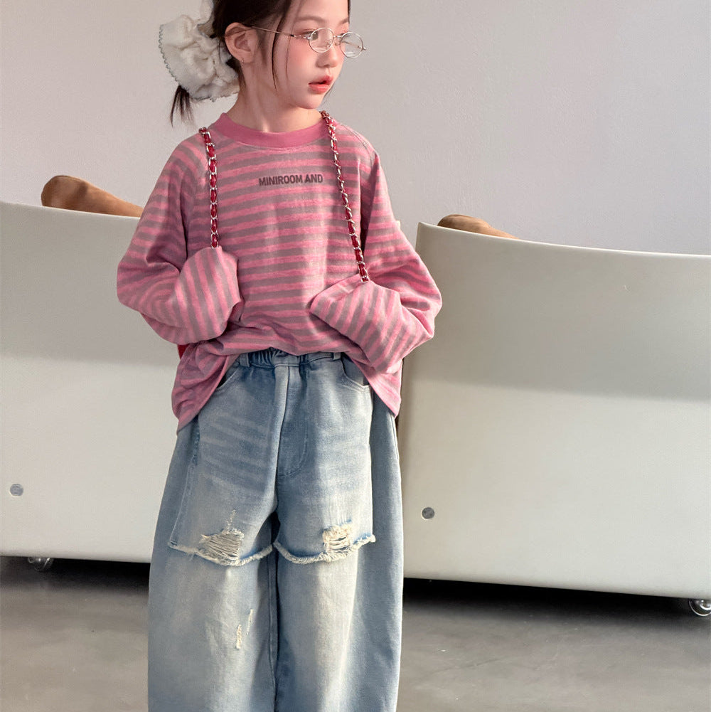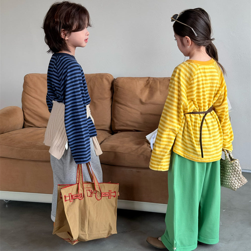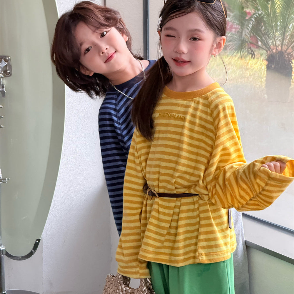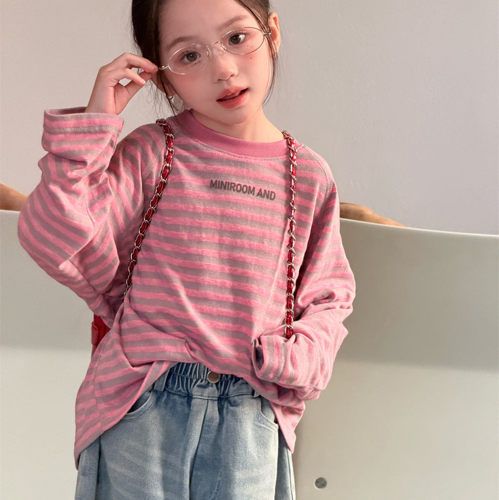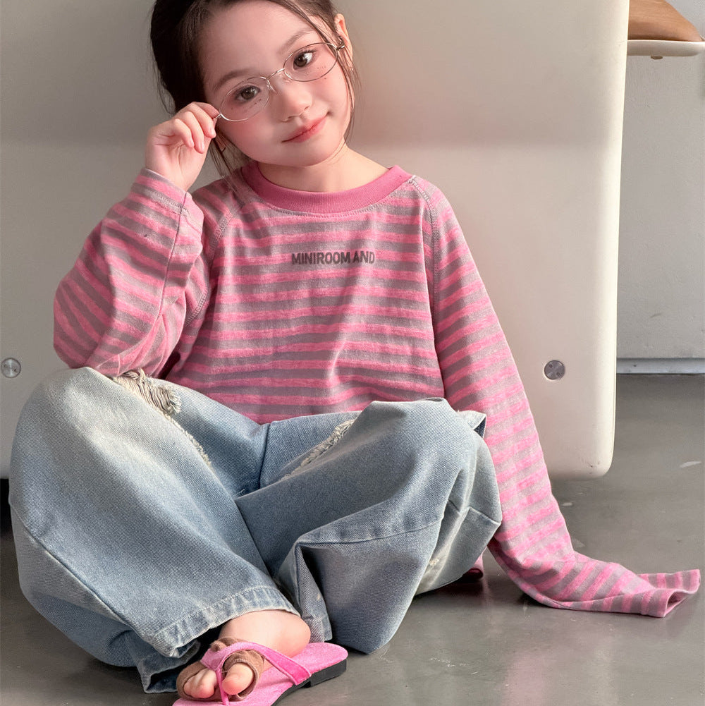 【90-150】ボーダーミニ英字ロゴ長袖Tシャツ