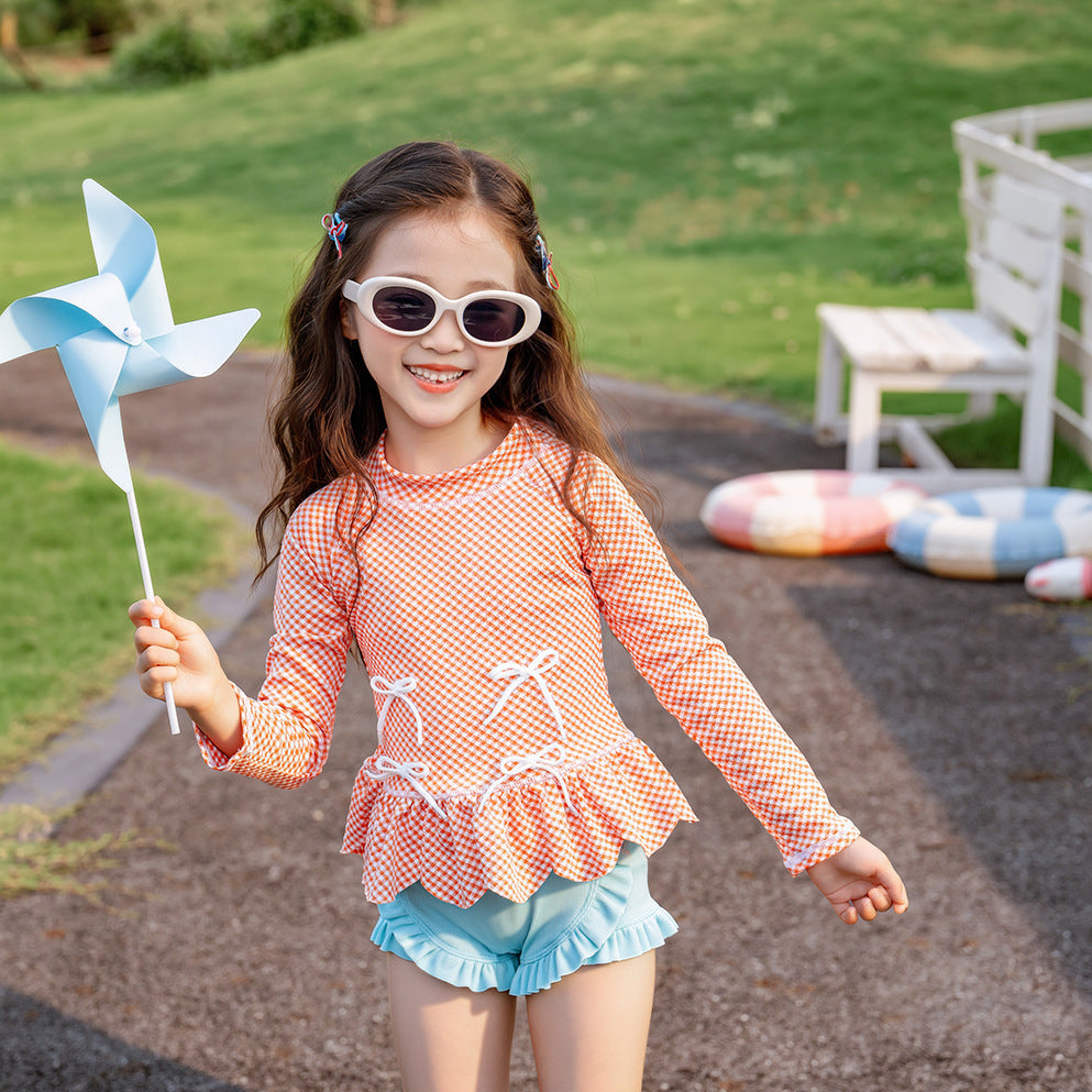 【90-140】リボンTシャツ×チェック柄ロングパンツセット