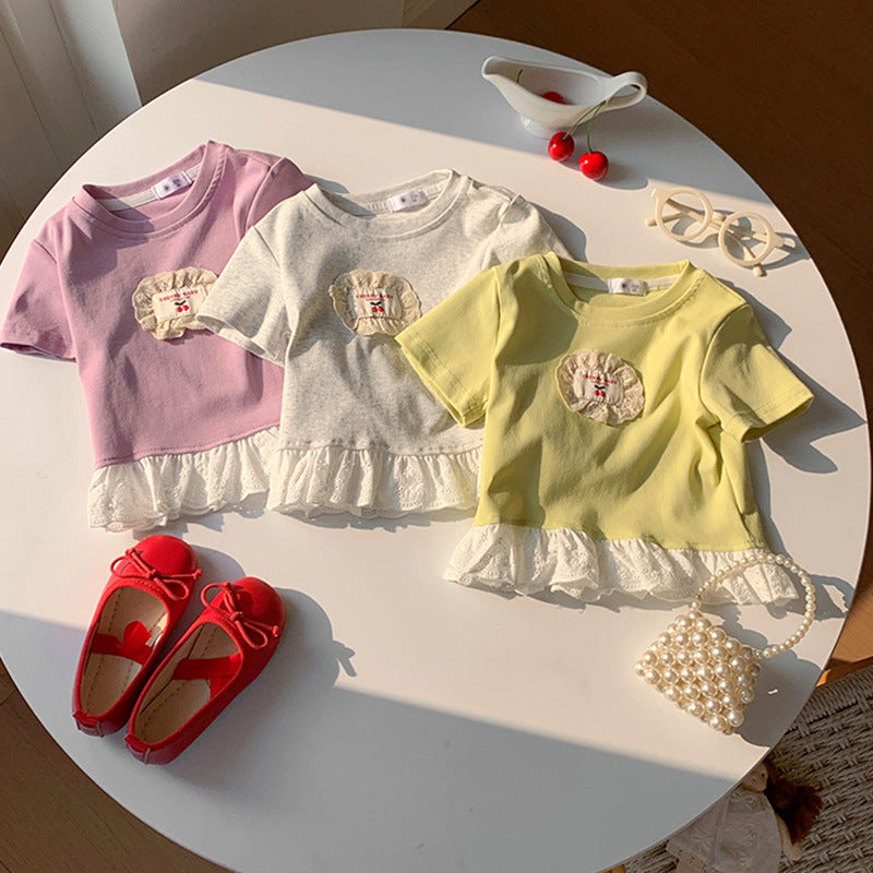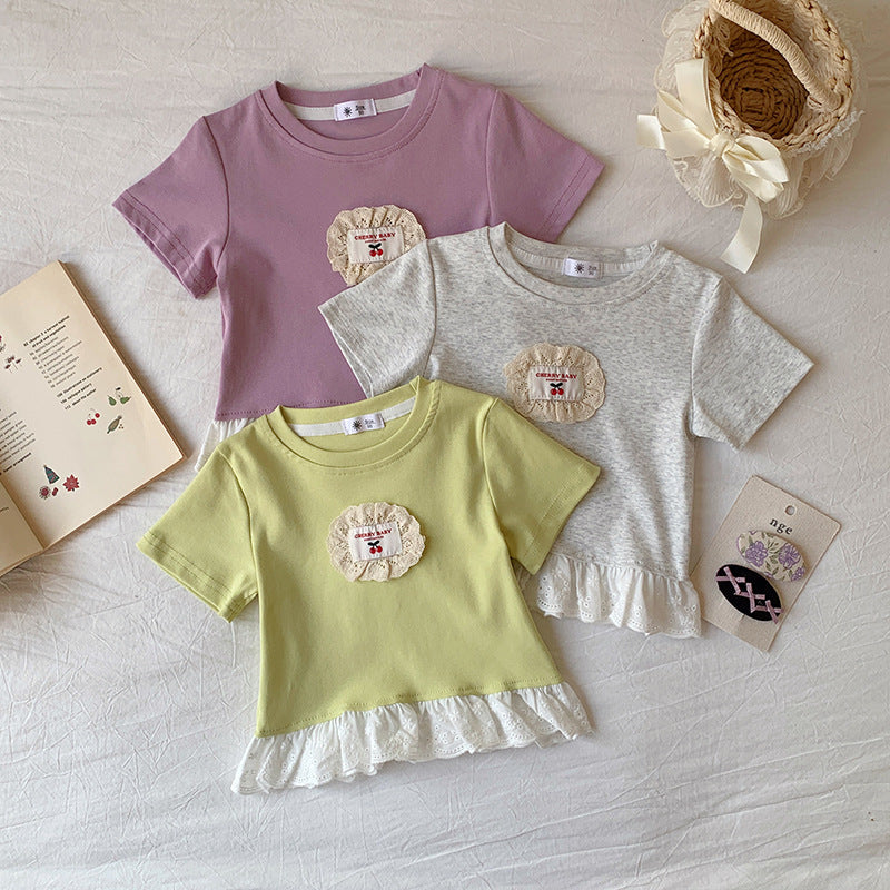 【90-140】ワンポイントワッペンレースヘムTシャツ